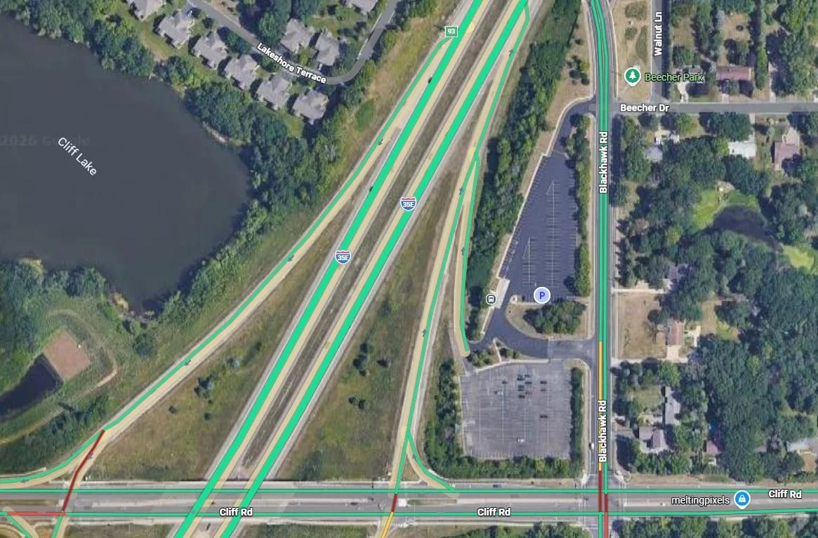 During the incident, the northbound on-ramp from Cliff Road to I-35E was temporarily closed as officers secured the scene, searched the vehicle, and conducted their investigation. At the scene, a dark gray small SUV was observed facing the wrong way on the northbound ramp, indicating the abrupt end of the pursuit.