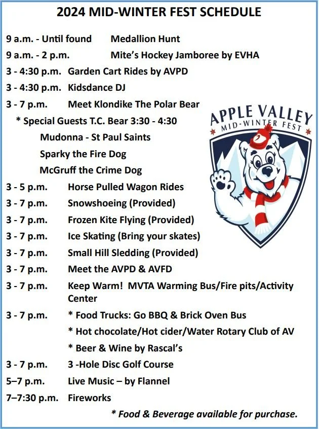 APPLE VALLEY, MINNESOTA - Apple Valley's annual Mid-Winter Fest returns on Saturday, February 3, 2024, at Johnny Cake Ridge Park West! This annual festival began in 1978 and has been a tradition for the City of Apple Valley, Minnesota, since.