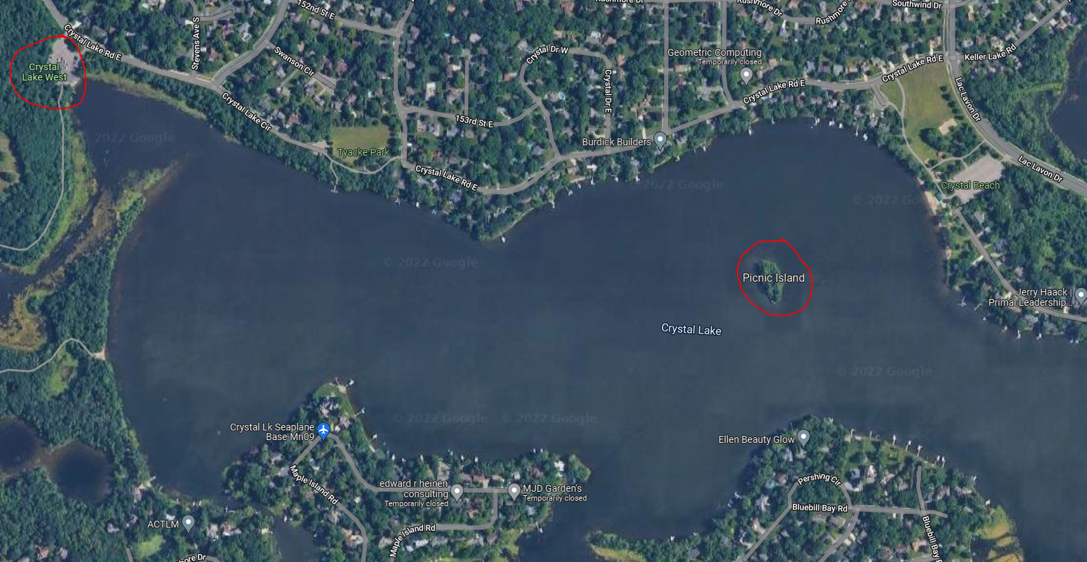 Google map image of the Crystal Lake in Burnsville, Minnesota. Picnic Island and The Crystal Lake West boat ramp have been circled in red.