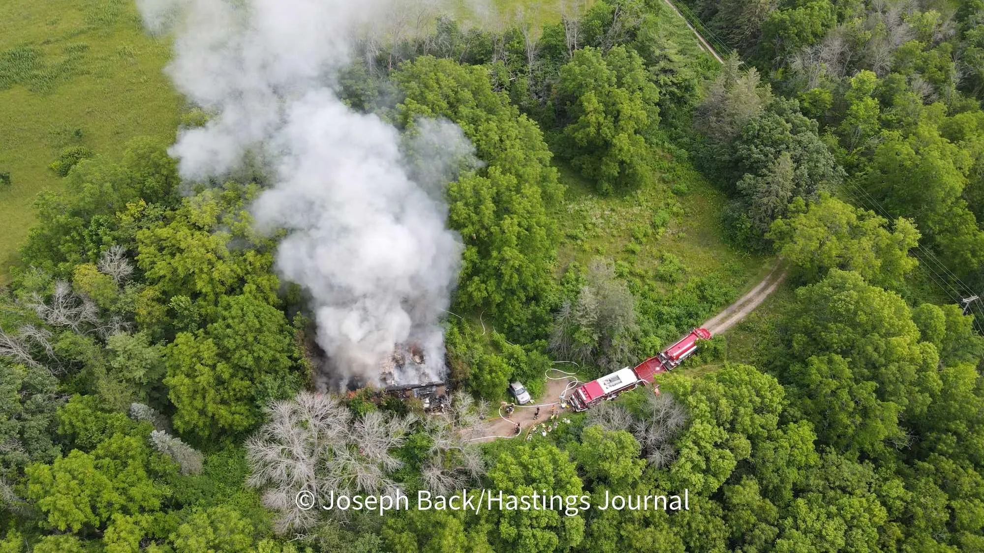 As of 11:55 AM, law enforcement has been unable to provide additional information on the incident. According to reporters with the Hastings Journal, the road has been closed off, and no additional information has been provided. The residence is back in the woods off of Saint Croix Trail South. Crews remain on scene and are working to extinguish the fire.