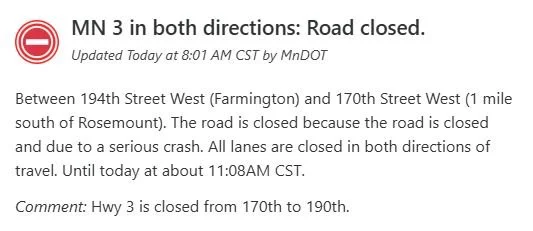 The Dakota County Sheriff’s Office reported that Highway 3 is closed between 170th Street and 190th Street, from roundabout to roundabout, while emergency crews respond and investigators work the scene. Motorists are urged to avoid the area and seek alternate routes.