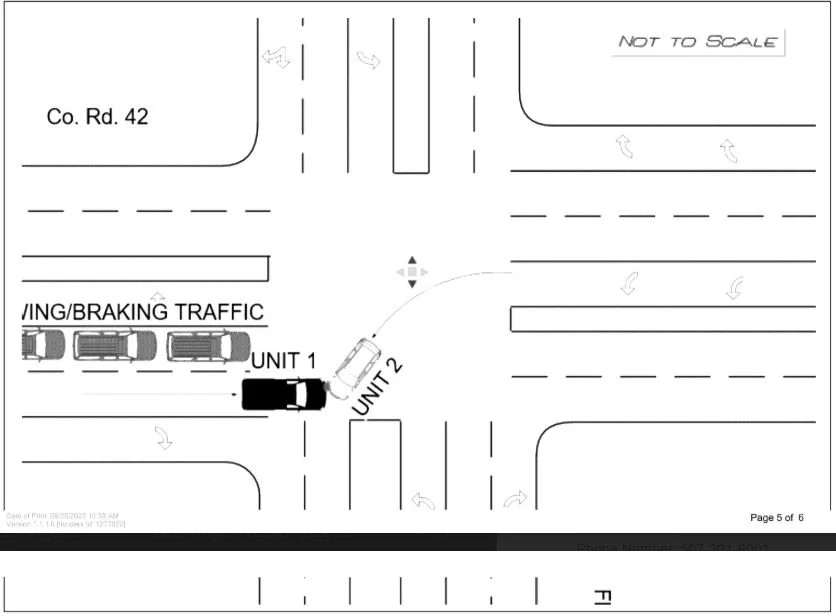 According to the Apple Valley Police crash report, Unit #1, a 2021 Ford F-150 driven by an 80-year-old man from Farmington, was traveling eastbound in the right lane of County Road 42 approaching Flagstaff. Unit #2, a 2020 BMW X3 driven by a 58-year-old Apple Valley man, was attempting to turn left from westbound County Road 42 onto southbound Flagstaff when the collision occurred.