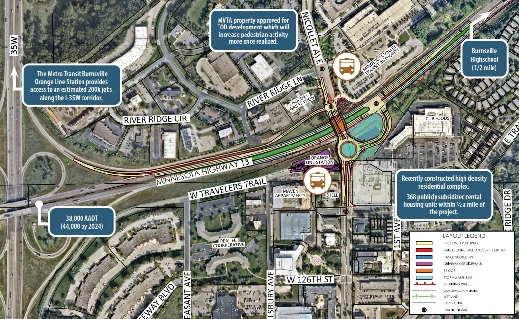 The project proposes transforming 3.5 miles of Highway 13 into a four-lane expressway with grade-separated intersections, significantly reducing congestion and crash risks along the route. Highway 13 currently serves as a vital connector between residential neighborhoods, employment centers, and freight routes—linking communities across Savage, Burnsville, and the greater Twin Cities metropolitan area. The upgrades will improve safety for all users, including commuters, truck drivers, and transit riders, while bolstering access to local businesses and regional job centers.