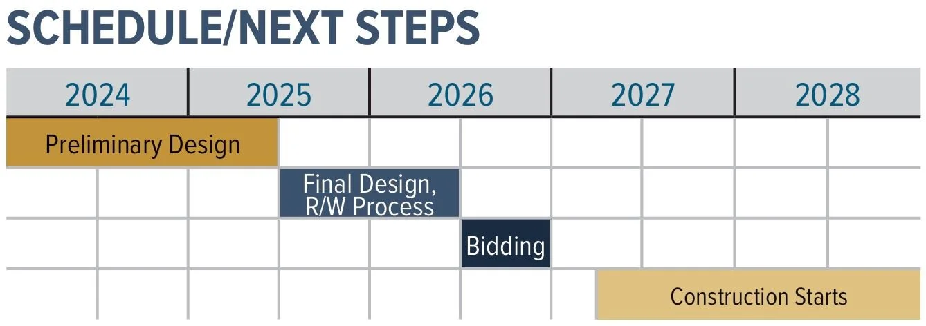 If fully funded, the project would progress through final design and right-of-way work by 2026, with construction beginning in 2027 and continuing through 2028.