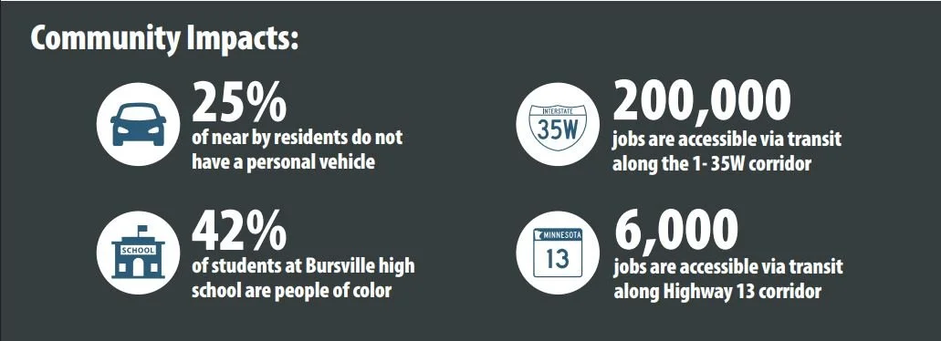 Beyond congestion relief, the Nicollet Avenue project aims to improve pedestrian and bicycle connectivity and enhance stormwater management. Approximately 25% of nearby residents do not own a vehicle, underscoring the need for improved transit access. The area connects to two regional transit hubs and supports over 200,000 jobs along the I-35W corridor and 6,000 jobs along Highway 13.