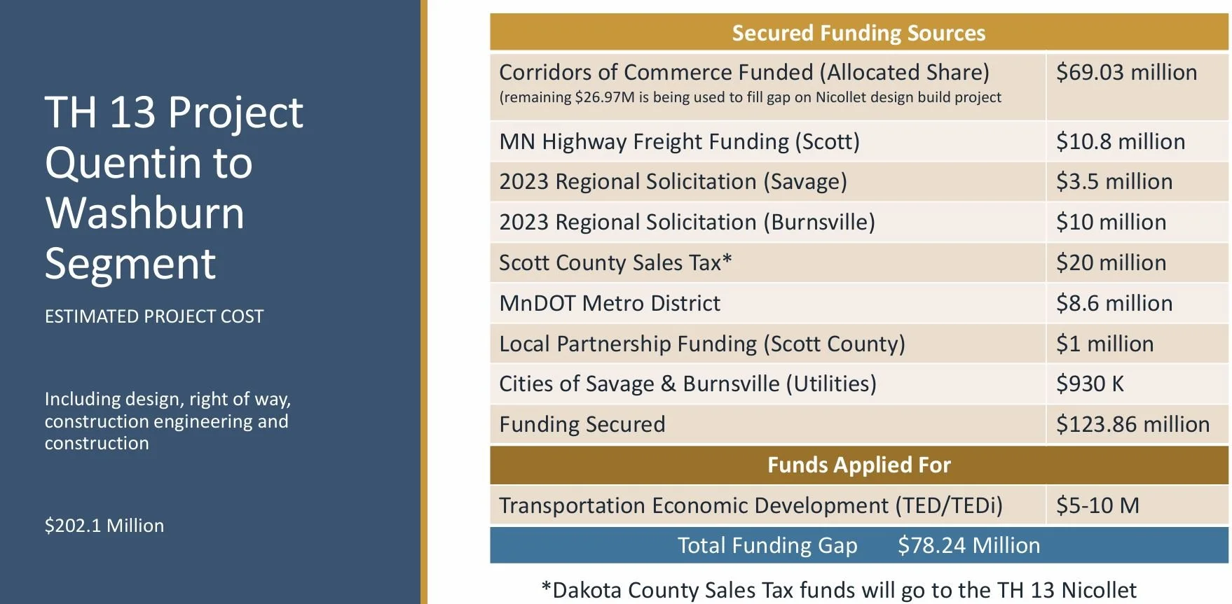 The Highway 13 River, Rail, and Roads Initiative and the Nicollet Avenue Mobility Improvement Project represent a collaborative, forward-looking investment in the future of the south metro. Together, they will reduce crashes, improve freight and commuter efficiency, and unlock new opportunities for economic growth and connectivity across Burnsville, Savage, Scott County, and Dakota County.