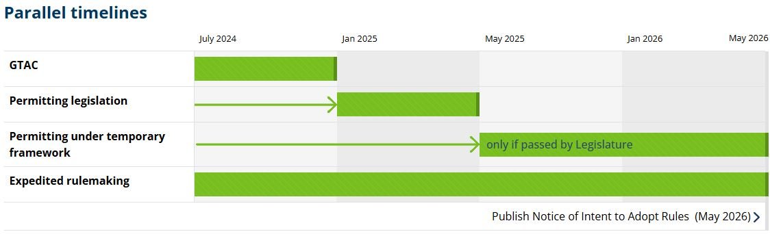 GTAC will incorporate feedback from the public, tribal governments, and stakeholders before submitting its final recommendations in January 2025. If the temporary framework is approved by the legislature and governor, permitting for gas development can begin while permanent rules are being developed. The entire regulatory process is expected to conclude by mid-2026.