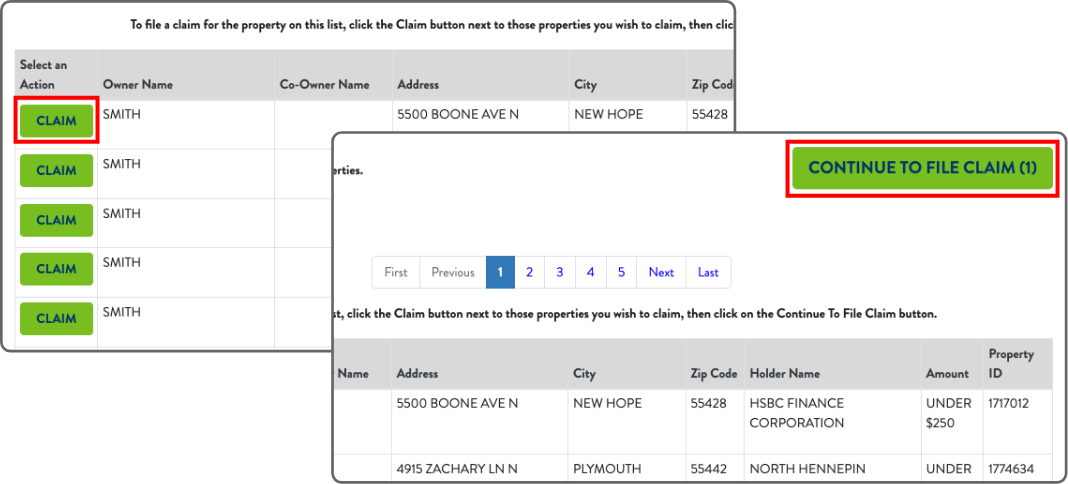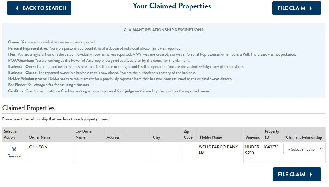 If you find an Unclaimed Property that matches your name and address, you can click the "Claim" button on the left side of the page to select all the property that belongs to you. A prompt will then say, "Continue to File Claim" at the top and bottom of the page, which you can click to take you to the next step.