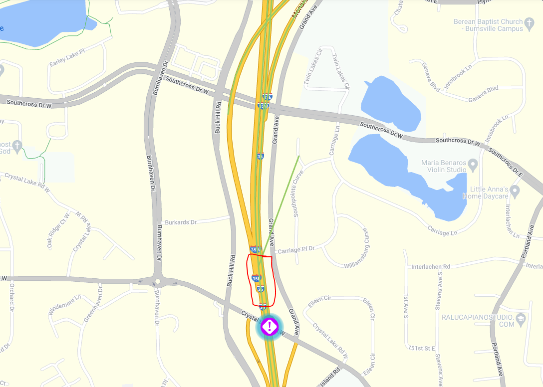 Around 5:25 AM on Wednesday, November 9th two multi-vehicle wrecks occurred on northbound I-35 just north of Crystal Lake Rd and just south of the I-35 East-West split in Burnsville, Minnesota. Several emergency crews are on the scene. No reports of initial injuries, but police are reporting they at least two vehicles are disabled and not moveable. Fire and EMS were called just in case.