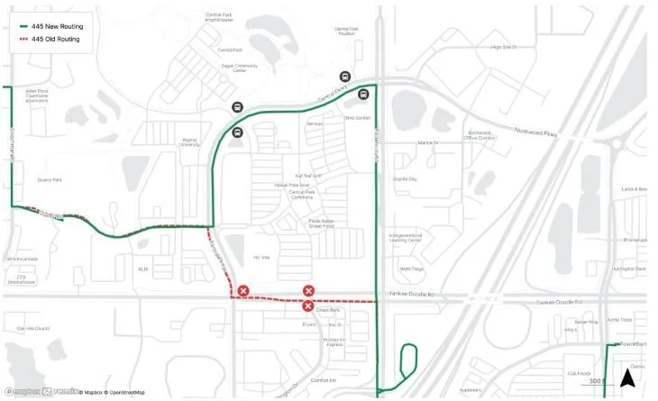 Stops at Yankee Doodle Road and Washington Drive, and Yankee Doodle Road and Central Parkway, will be removed.