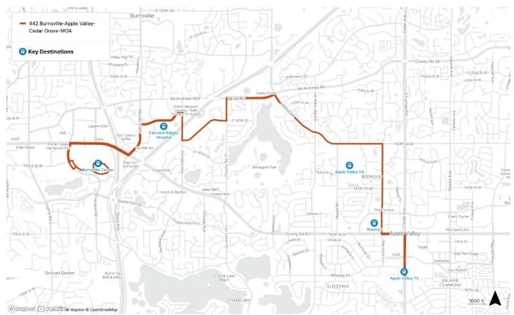 Route 442 will discontinue service between the Apple Valley Transit Station and the Mall of America. Alternative service options remain available via Route 440 and the METRO Red Line.