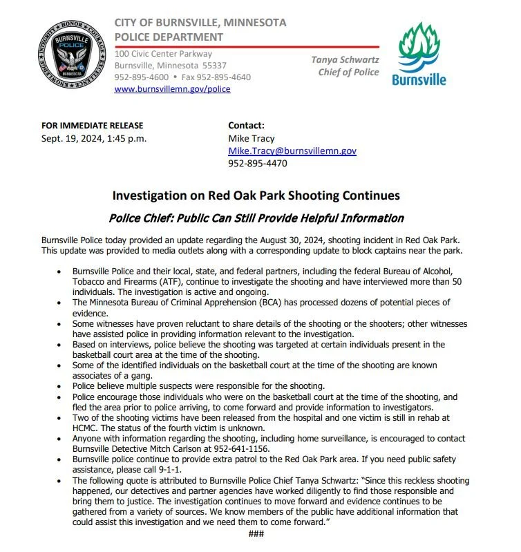 BURNSVILLE, MINNESOTA - The Burnsville Police Department provided a new update today regarding the ongoing investigation into the August 30, 2024, shooting incident at Red Oak Park. The update emphasized that the investigation remains active and urged community members to come forward with any helpful information.