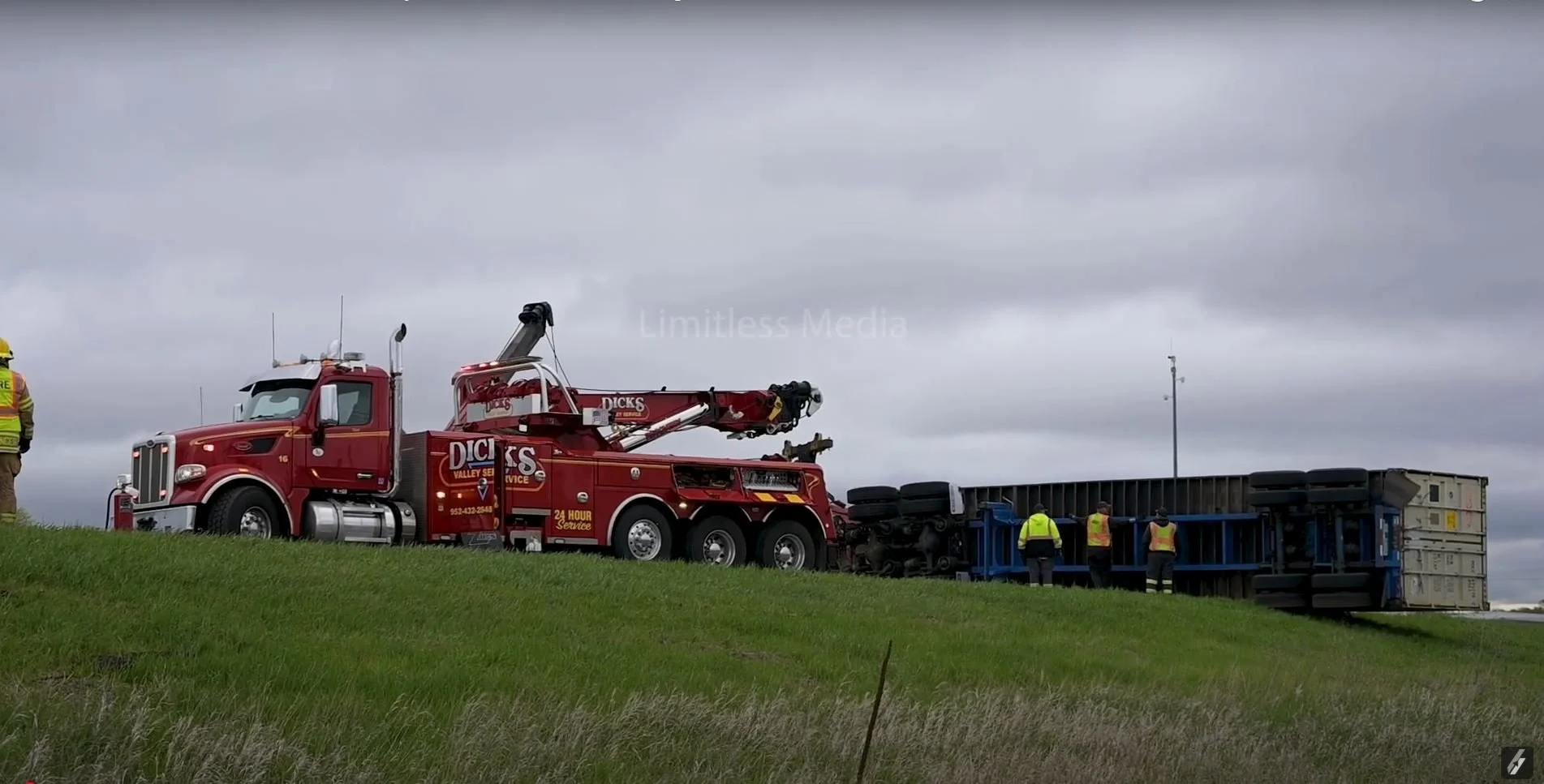Traffic is being diverted to eastbound Highway 55 while crews work to clear the scene. Authorities initially believed the semi was leaking fuel, but the State Patrol has since confirmed that only motor oil spilled. Rosemount Fire Department and Dick’s Towing responded to assist with cleanup and containment of the spill, and Dick’s Towing was also handling uprighting the semi and crash clean up.