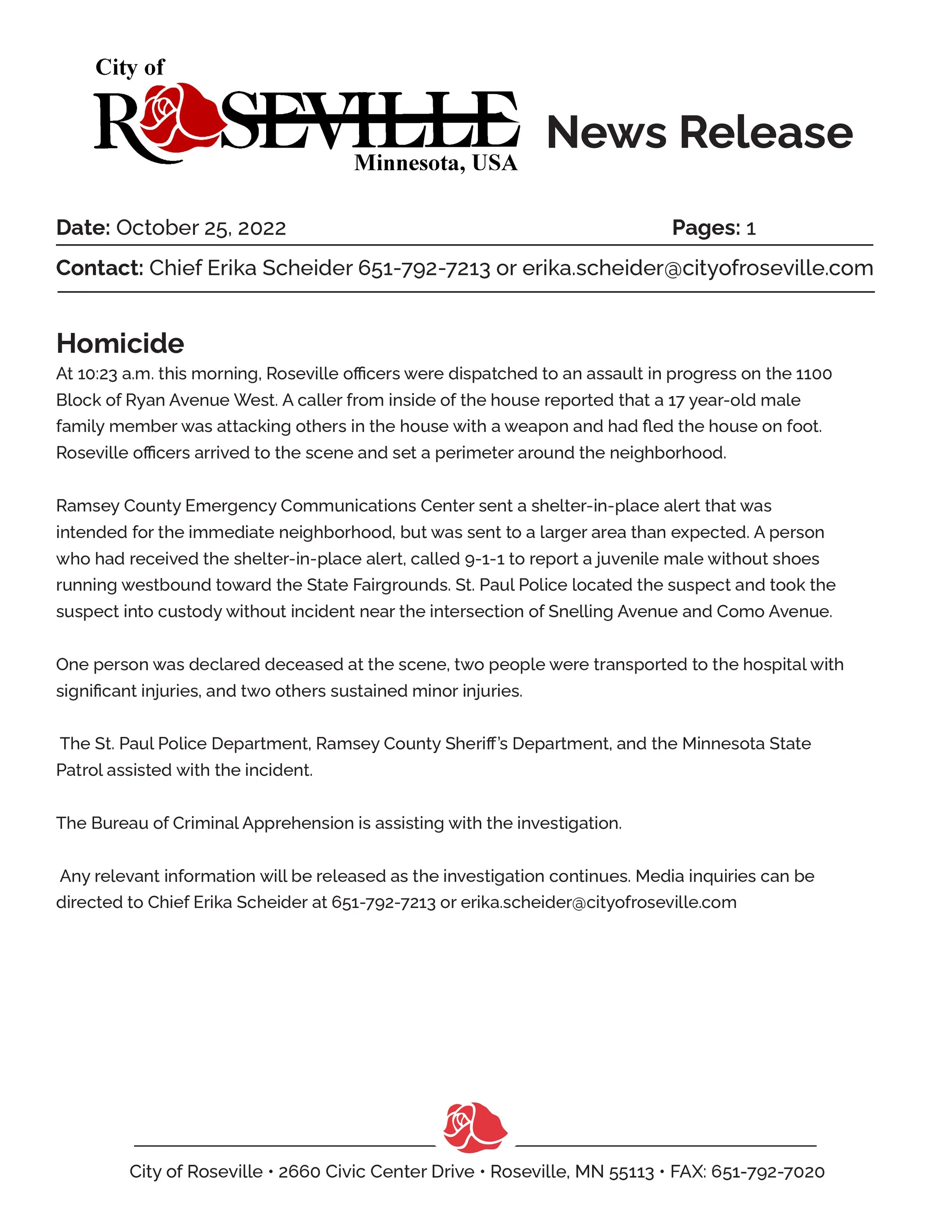 According to a press release from the City of Roseville, police were dispatched to the 1100 block of Ryan Avenue West for an assault in progress. A caller in the residence was reporting a 17-year-old male family member was attacking others in the home with a weapon. The 17-year-old then fled the home on foot. When officers arrived on the scene, they set up a perimeter in the neighborhood the assault occurred.