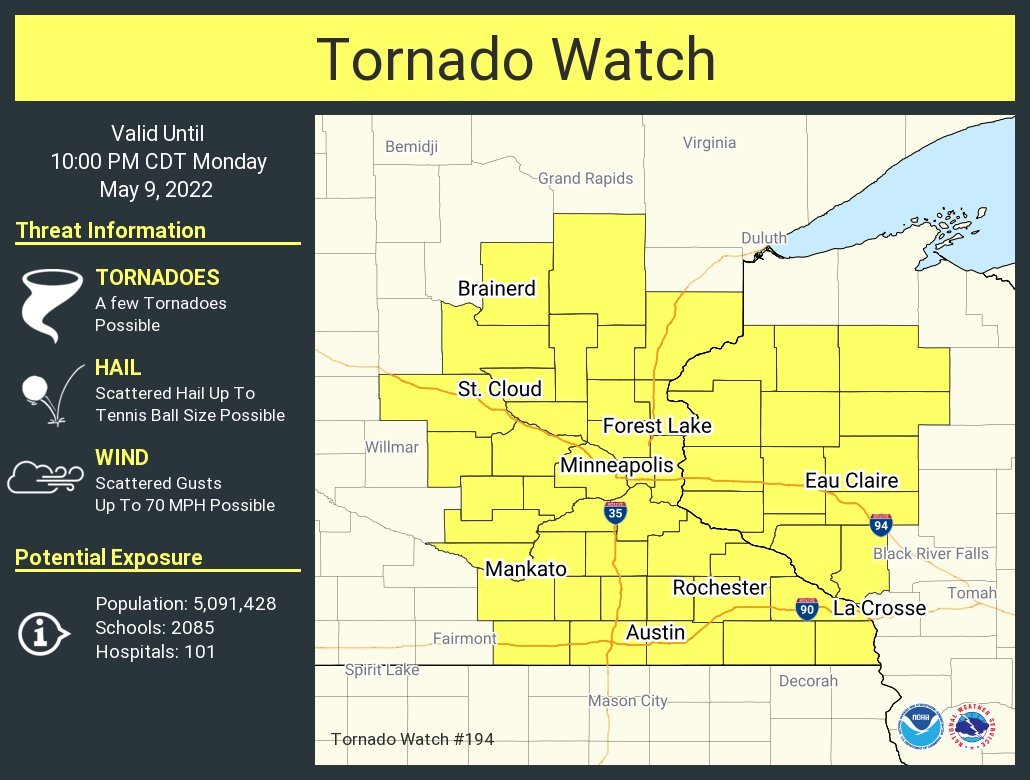 A tornado watch has been issued for parts of Minnesota and Wisconsin until 10 PM CDT