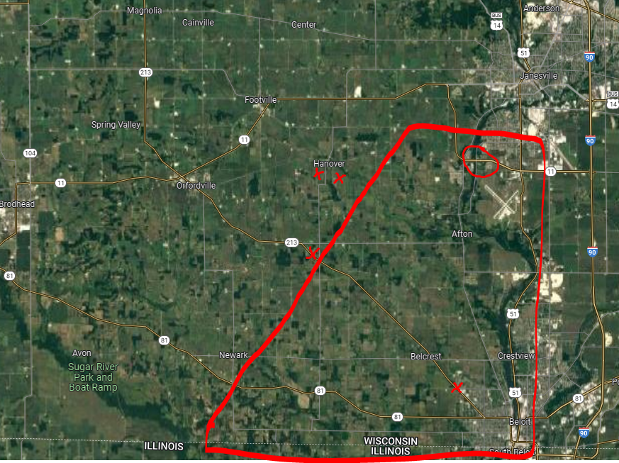 Once in Wisconsin, archived radar data shows that the storm that promoted the initial tornado warning looks to have strengthened once again, with another tightening couplet just to the east-southeast of the Town of Newark along County Road 81 as the storm worked off to the northeast. The couplet reached its second point of peak intensity in the area of W Beloit Newark Rd and S Smythe School Rd which is just east of Newark, WI. To the northeast of that, there appear to be some unconfirmed damage reports. There is also one unconfirmed report of a funnel cloud just north of the Janesville, WI airport [visible in the map below where the circle is].