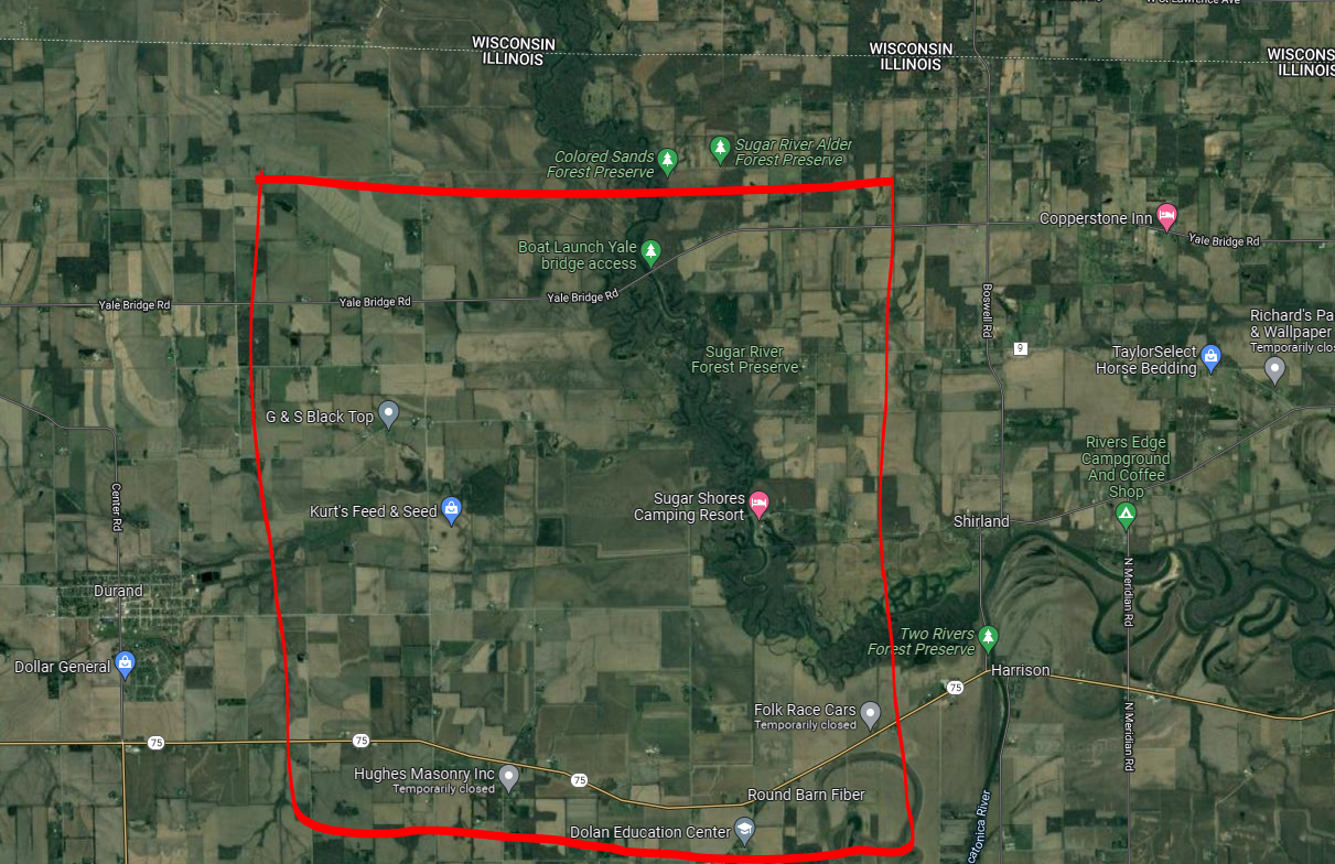 Taking a closer look at archived radar data, a video of this can be found at the top of this article, you can see a tightening couplet just north of County Road 75 (Freeport Rd), between Wheeler Rd and Shirland, IL. The possible tornado appears to have tracked close to if not over the Sugar Shores Camping Resort or Sugar River Forest Preserve Campground. I have put a square roughly around the area of interest in the image below.