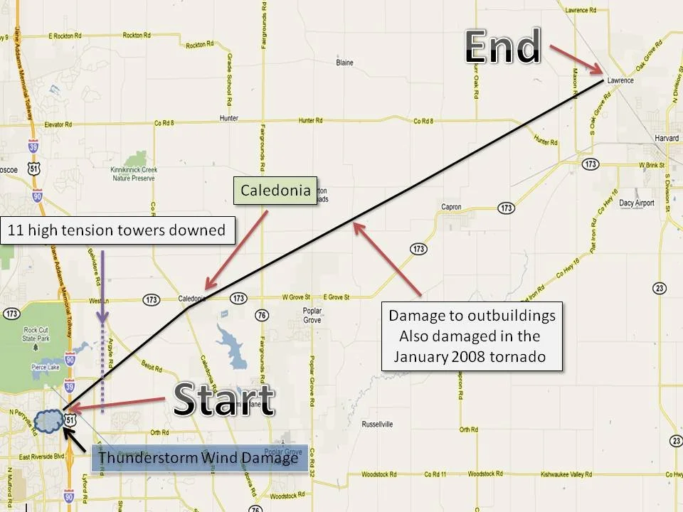 The tornado first touched down around 3:04 PM in east-central Winnebago County, a mile east of Rock Cut State Park and about a quarter mile southwest of the Argyle-Harlem Road intersection. Near here, the tornado blew over a school bus with six people onboard who all suffered minor injuries and took down eleven high-tension electrical towers.