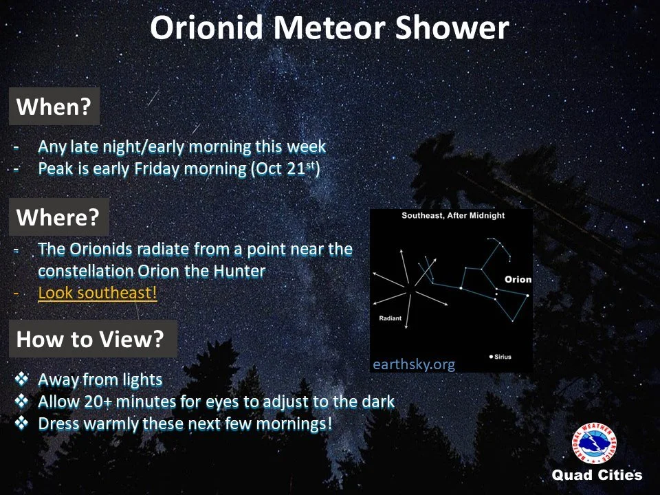 While the Orionid meteor shower will remain active through early November, it will peak late on Friday, October 21st, into the early morning hours of Saturday, October 22nd. The Orionid meteor shower has produced up to 80 meteors an hour, but around 20-30 meteors an hour are more likely. The meteor shower is a result of Earth passing through the debris left behind from Comet 1P, otherwise known as Halley’s Comet.