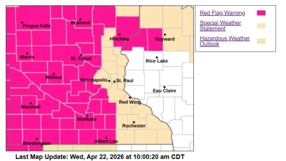 TWIN CITIES, MINNESOTA - Residents across the Twin Cities metro and much of east-central Minnesota are being urged to use extreme caution on Wednesday afternoon (today) as near-critical fire weather conditions develop, according to the National Weather Service Twin Cities/Chanhassen, MN.