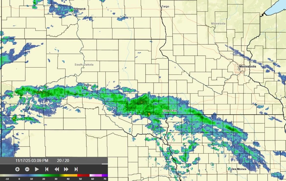 A band of rain is already developing across southern South Dakota, with thunderstorms farther southeast [pictured below]. This band will lift into southern Minnesota this evening, bringing widespread rain that may mix with or change to snow overnight.