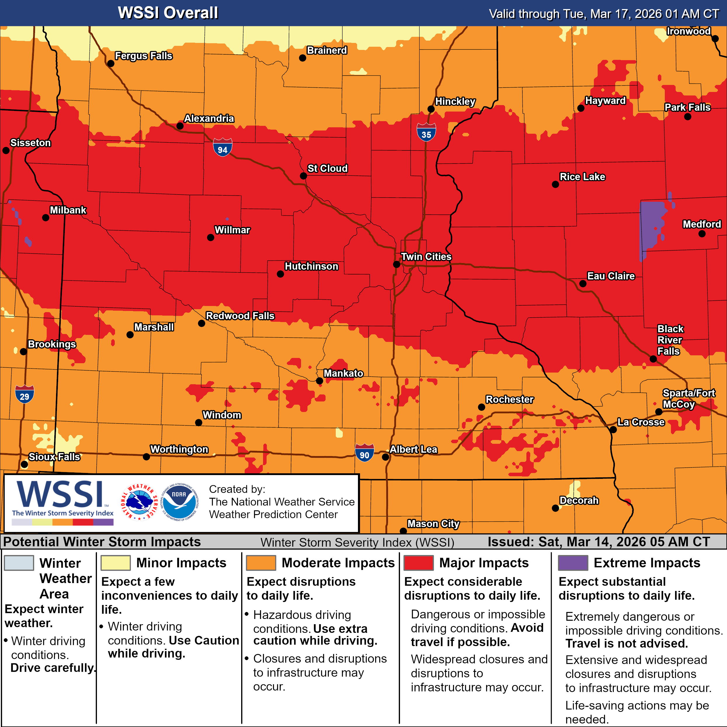 The National Weather Service in the Twin Cities has upgraded the region to a Winter Storm Warning, warning that travel could become very difficult or even impossible late Saturday night through Sunday as heavy snow and strong winds combine to create near-blizzard conditions. Just to the west of the Twin Cities, the NWS has issued Blizzard Warnings for wind gusts of 45-50 mph, which will cause blowing and drifting snow and reduced visibility on Sunday into Monday.