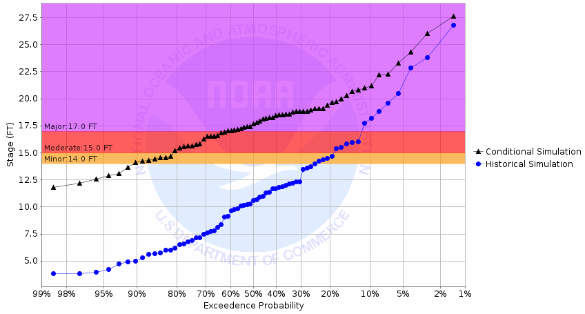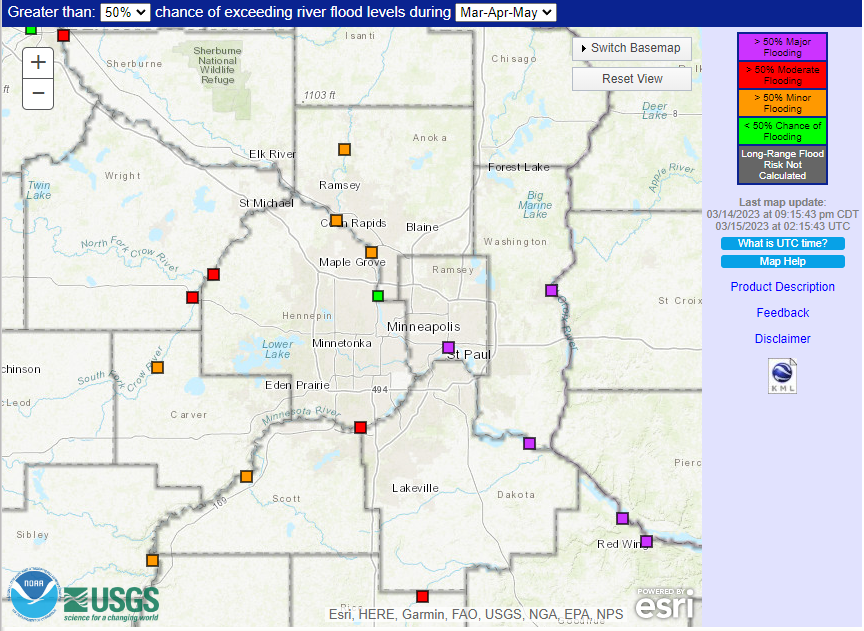 Greater than 50% chance of exceeding river flood levels during March, April, and May