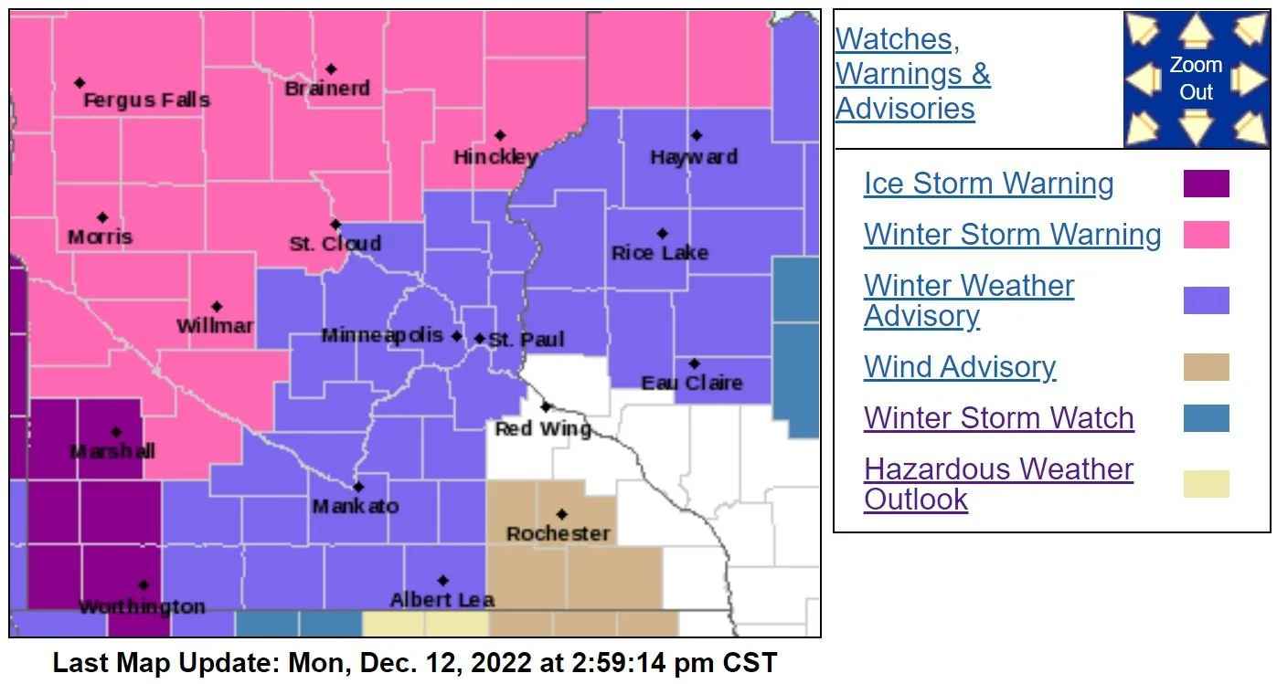 Winds will again be a big factor with this storm across the Twin Cities metro Tuesday into Wednesday, as this strong low pressure works across the region. Winds will be out of the south-southeast advecting both the warmer temperatures and moisture into this system from the south. Wind gusts could be in excess of 45 mph on Wednesday, so if you have Christmas decorations that are at risk of blowing away it is recommended that you tie them down or take them in.